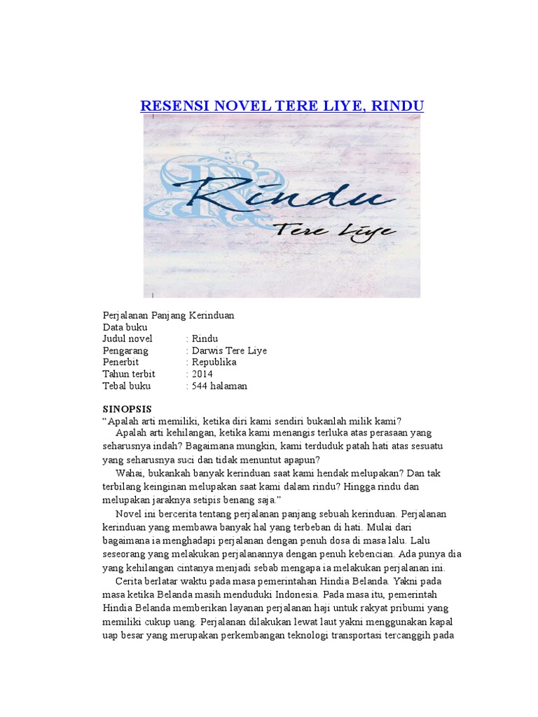 Novel setebal 544 halaman ini menggabungkan antara sejarah, fiksi, romantisme, serta kisah inspiratif dalam sebuah perjalanan suci. Apalah arti cinta, ketika menangis terluka atas perasaan yg seharusnya indah? Apalah arti memiliki, ketika diri kami sendiri bukanlah milik kami? 1 desember 1938 pertama kalinya dalam sejarah kota makassar dinggahi oleh sebuah kapal yang sangat. Rindu karya darwis tere liye, setelah itu diteliti dan dianalisis.